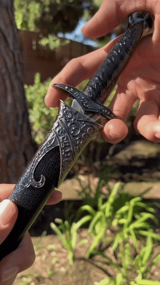 The dagger features a stainless steel blade with a zinc alloy hilt, finished with intricate elvish-style engravings. It’s designed for display and cosplay — not for functional use.